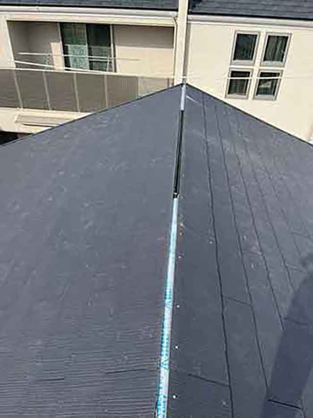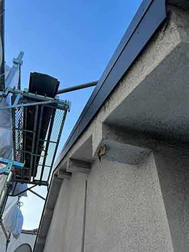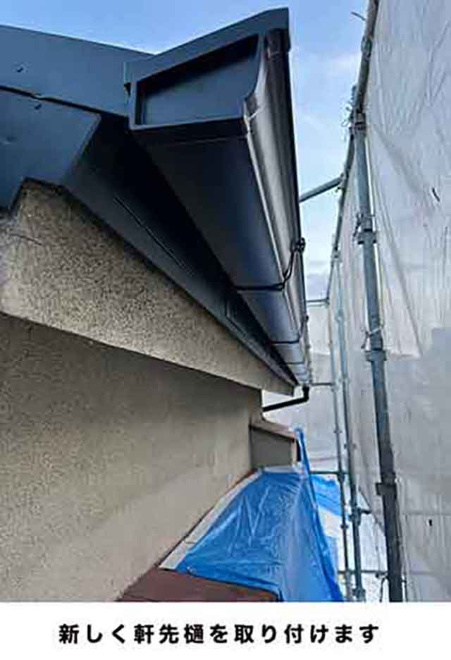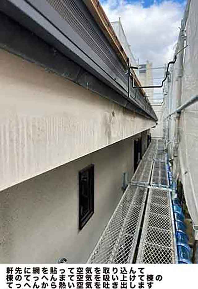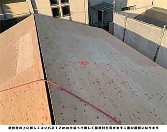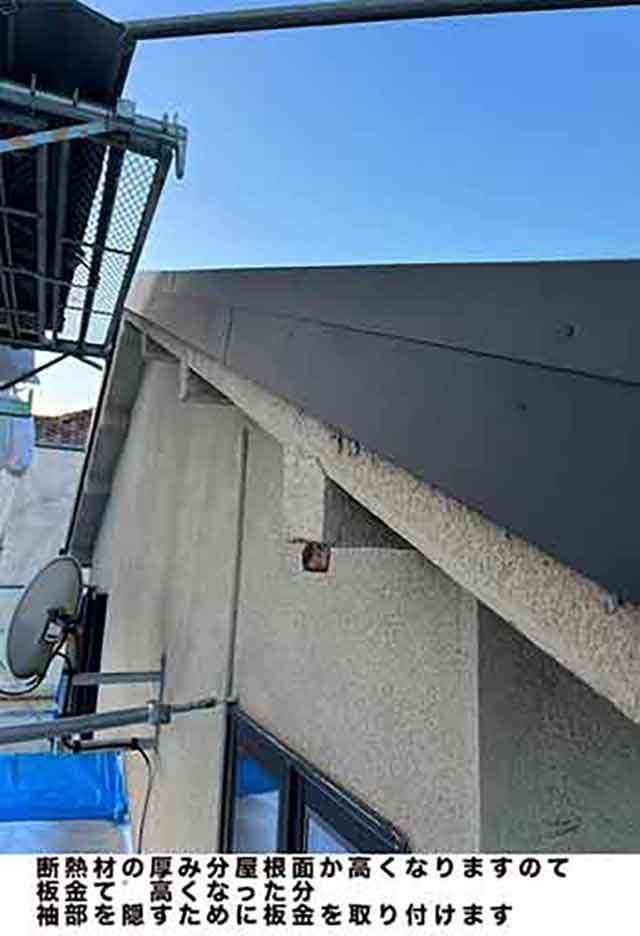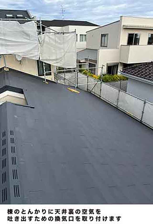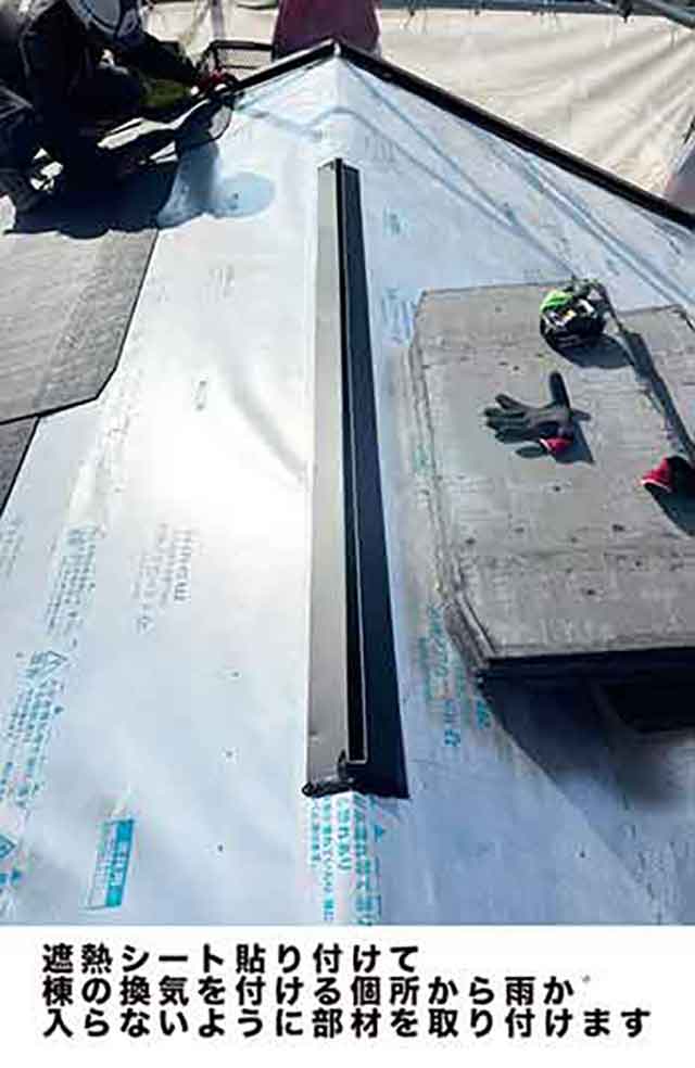 | A袖部 G 袖部 断熱材を入れたため 屋根面が高くなったので高くなった分隙間が 空くので隠すために板金を使います C D部 軒先は空気を棟の換気まで送るために 吸い込みのため穴の開いた 金属の吸気のための板金を取り付けます。 その跡新しいい軒樋を取り付けるための樋の 受け金具を屋根ん面に取り付けます。 E F G 部 屋根のとんがり 棟に5センチ幅の穴をあけて空気を 外部に出すための 部材換気棟を取り付けます。 H 屋根面には太陽の厚さを防ぐための目的の 遮熱シートを貼ります。 |